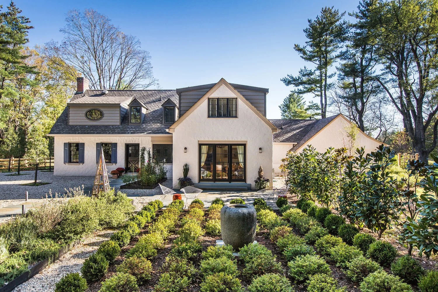 Jay Johnson - Irwin and the Irwin Weiner Interiors team put a lot of thought and love into this estate in Bucks County, half a mile from the scenic Delaware River. This was, after all, Irwin’s weekend home, and there was a lot of creativity and attention to detail to turn this once-ramshackle place into a charming spot. Imagine contractors touring the property over 7 years ago, coming away shaking their heads. Given up as a hopeless wreck, the place had morphed over the years into a chopped-up warren of apartments for five families. The basement was dark and frightening, there were tiny kitchenettes and showers squeezed into every conceivable space, and the 12-acre grounds were overrun with 50 years of weeds, junk trees, and neglect. It was an eyesore in an otherwise upscale neighborhood.