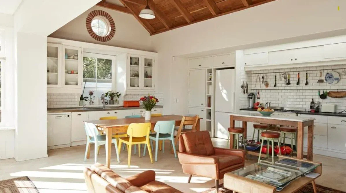 Kitchen: Warm off-whites or cream cabinets with a wood island and brass hardware create a welcoming hub. Consider a warm-toned tile backsplash for personality.