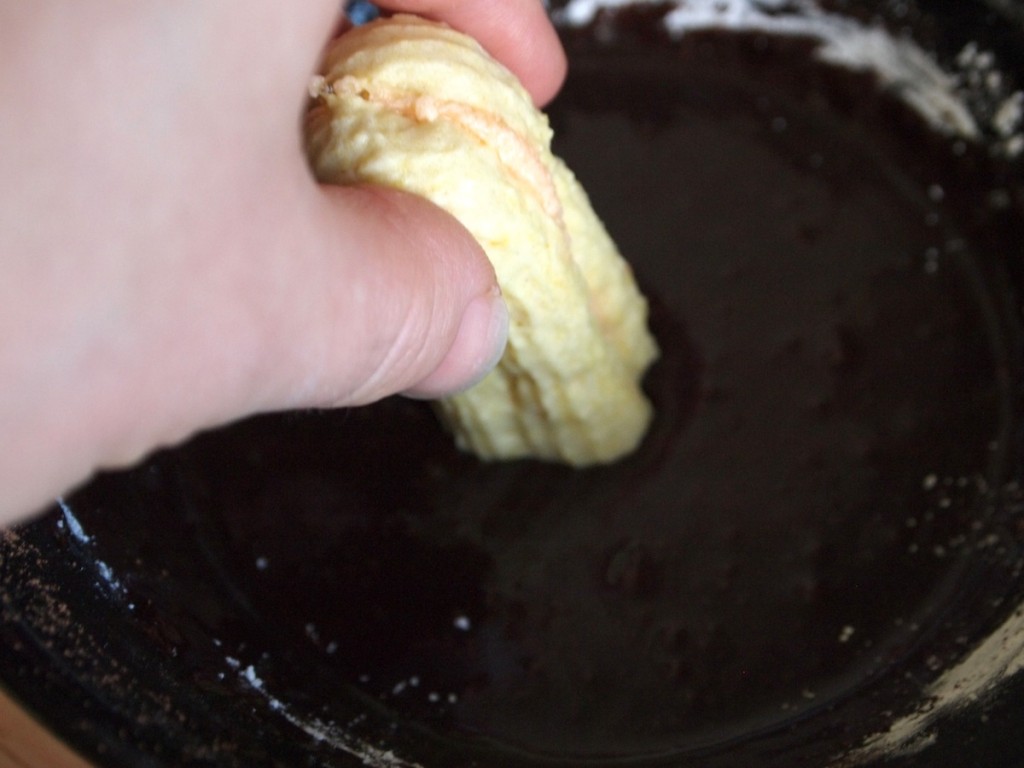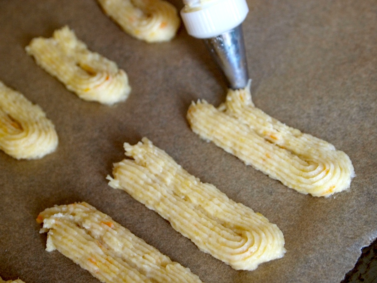Normally a pasty cookie dough doesn’t worry me. This recipe, however, required that the dough be piped out in elegant little fingers through a star tip. Well, actually I’m assuming that’s what Mrs. Beeton meant when she said to “pipe out the mixture in 3 1/2-4 inch length . . . using a vegetable star pipe.” I had to use a little muscle to get the piping started, but I managed to get some pretty cookies going. If you have a cookie press, though, by all means use it: it’ll make the going a lot easier.